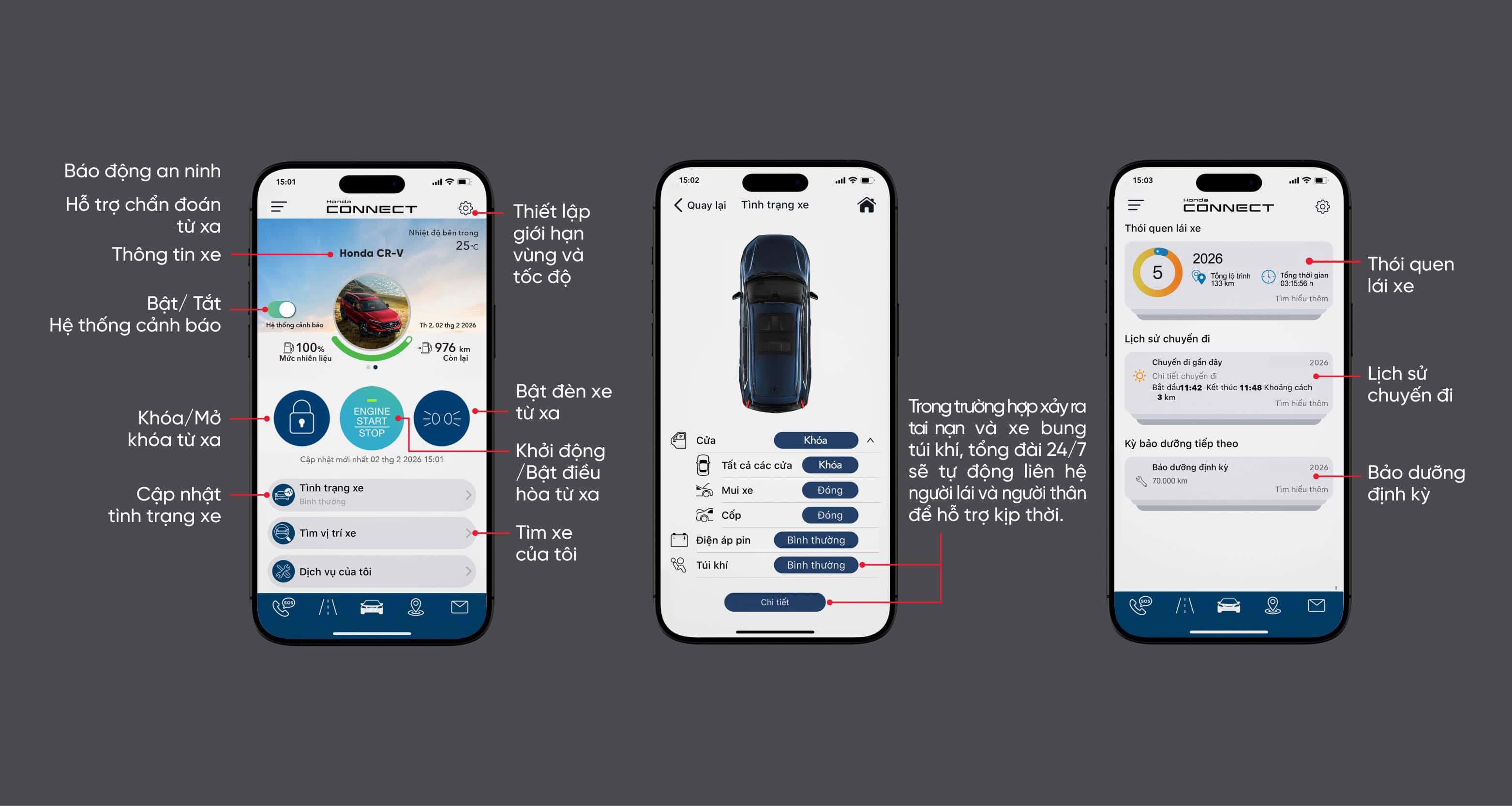 Hệ thống Honda CONNECT ưu việt liên kết giữa xe và điện thoại thông minh bằng sóng di động, đảm bảo mang đến trải nghiệm tiện nghi, an toàn và an ninh tuyệt đối, đi kèm với tổng đài hỗ trợ 24/7 (Yêu cầu điện thoại có kết nối mạng Internet)