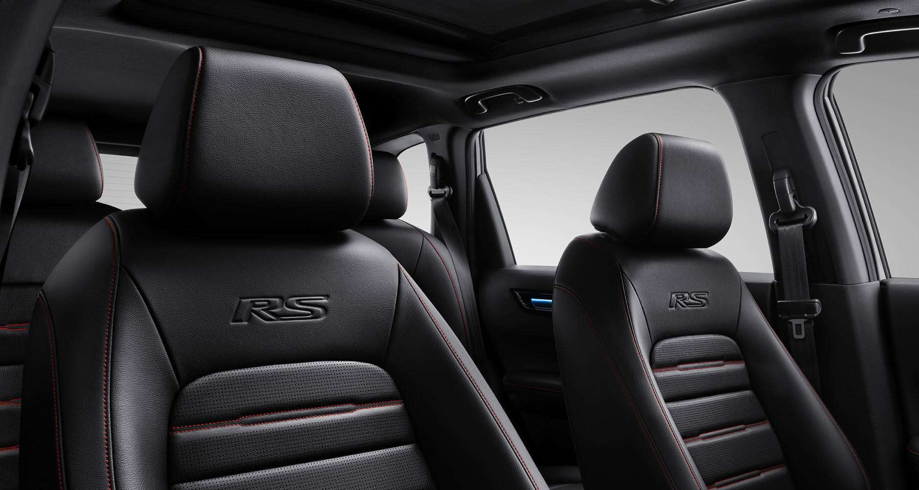 Ghế da thể thao cao cấp với điểm nhấn logo RS trên hàng ghế trước, kết hợp chỉ đỏ xuyên suốt (e:HEV RS).